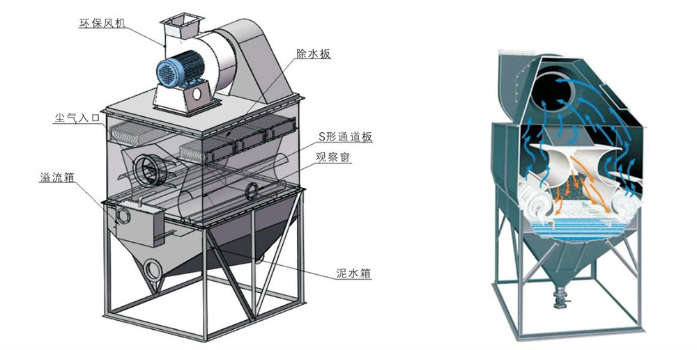 本設備主要由凈化箱、泥水箱、風機底蓋、擋水板、“S” 形板、自動補水箱、排污閥及風機等部分組成。含塵氣體由進風口進入凈化室,氣流轉彎向下沖擊于水面,部分較大的塵粒落入水中。當含塵氣體以18~35m/s的速度通過上、下葉片間的“S"形通道時,激起大量的水花形成一道水簾,使水、氣充分接觸,絕大部分微細粉融入水中,使含塵氣體得以充分凈化。凈化后的氣體經檔水板去除水霧后經風機排出。灰塵所形成的污泥沉積在除塵器底部,定期清除。箱內的水不斷循環使用,蒸發損耗的水由自動補水箱內的浮球閥進行補充,保持水位的恒定。
